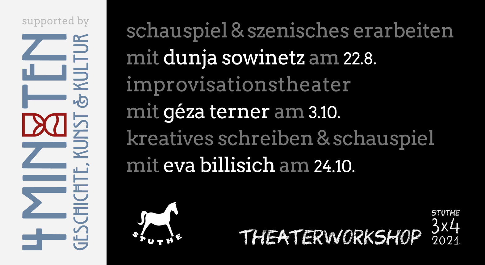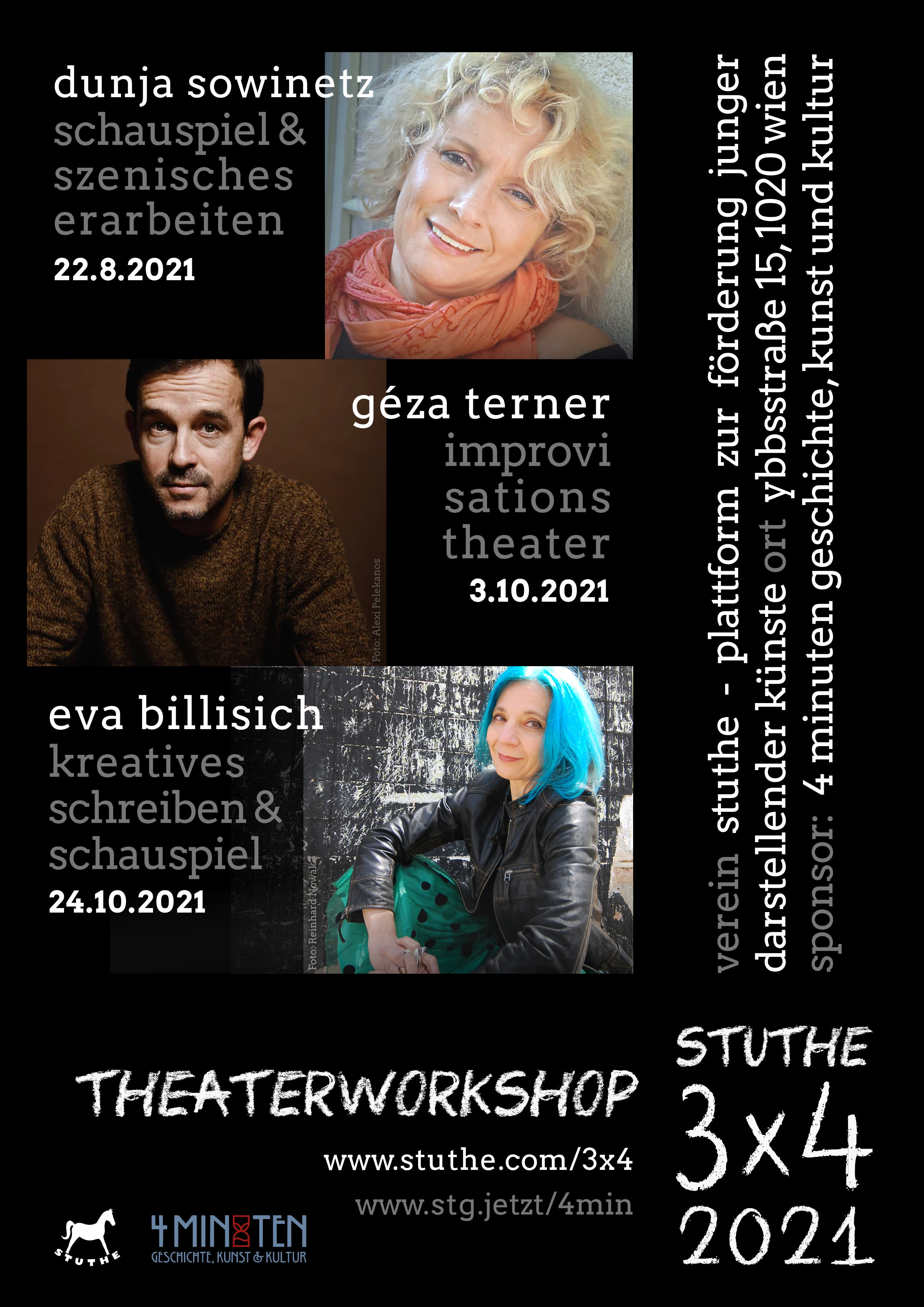 Alle drei Workshops finden im geräumigen Theatersaal der Ybbsstraße 15, 1020 Wien statt, wo auch eine Grundversorgung an Getränken zur Verfügung stehen wird.