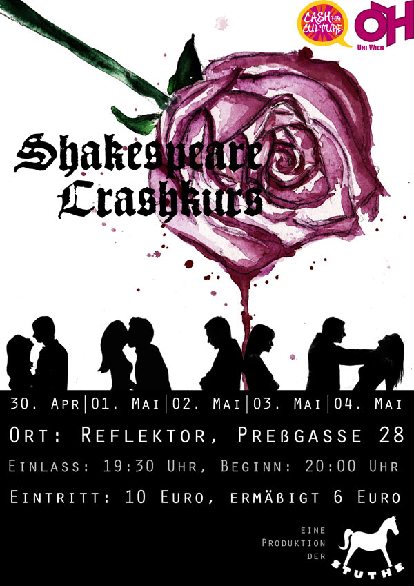 Aufgeführt werden einige ausgewählte Stücke von William Shakespeare: Othello, Romeo und Julia, Viel Lärm um Nichts und Sommernachtstraum. Diese wurden auf die wichtigsten Schlüsselszenen gekürzt und werden von einem Erzähler sowie verschiedenen MusikerInnen (Geige, Klavier, Sängerin, Harfe, Gitarre, Geige) vervollständigt. Im Hintergrund agieren zudem einige Studierende im Bereich Organisation, Dramaturgie und Stage Management. Der ganze Abend soll ein ’’Crashkurs’’ für Shakespeare Unwissende, Shakespeare LiebhaberInnen und die, die es noch werden wollen, sein. Außerdem wird auf die Aktualität der verschiedenen Themen in Shakespeares Stücken in der heutigen Zeit hingewiesen.